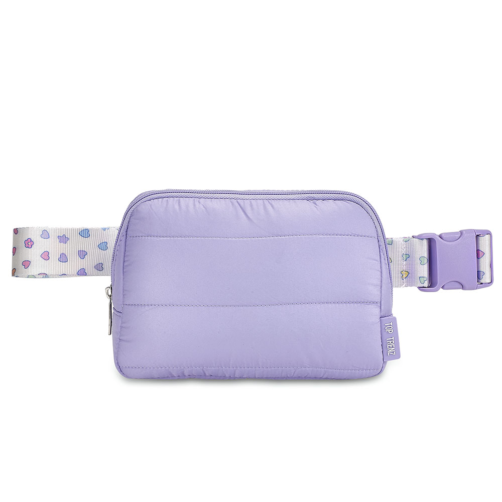 Purple Puffer Belt Bag with Rainbow Heart Strap