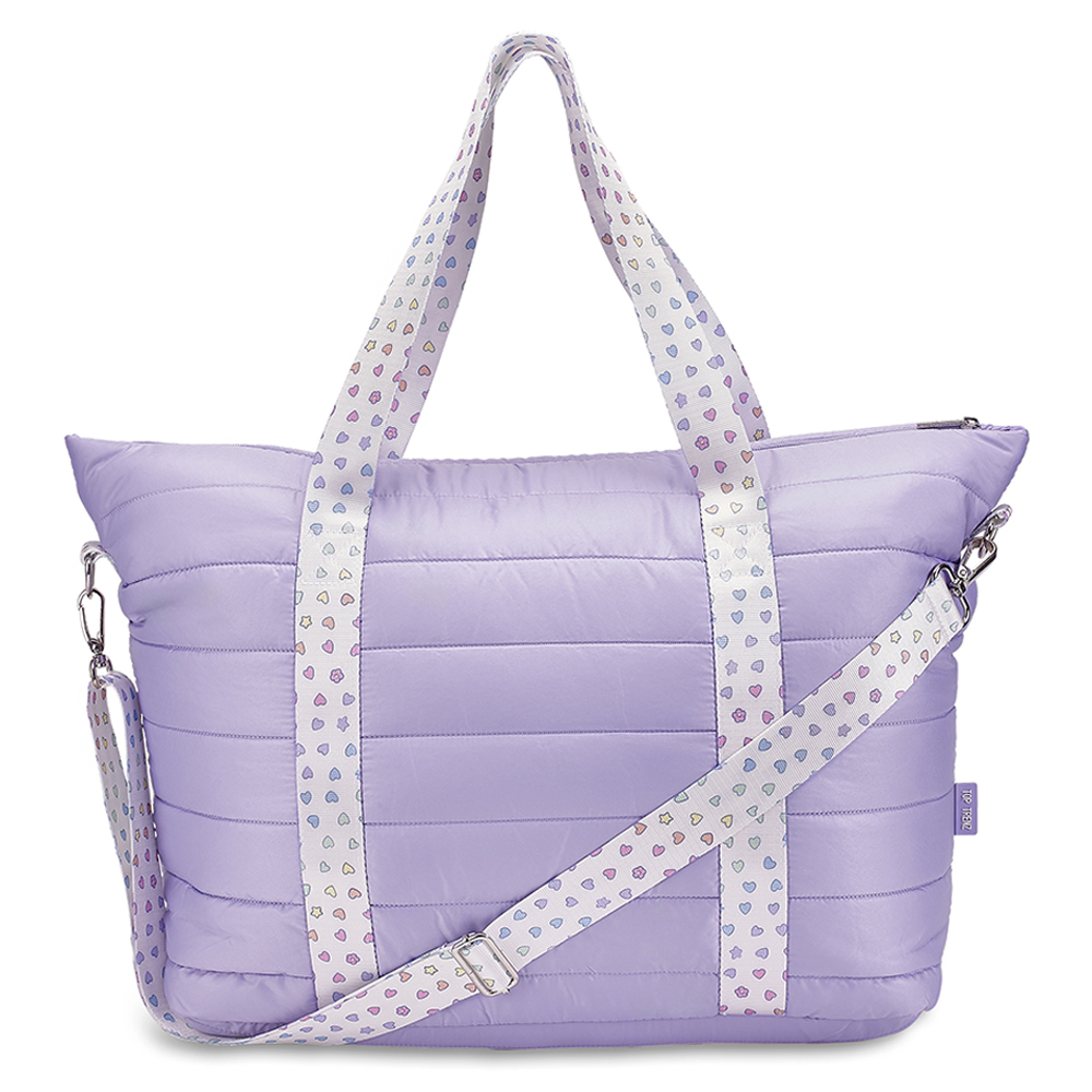 Purple Puffer Tote with Rainbow Heart Strap